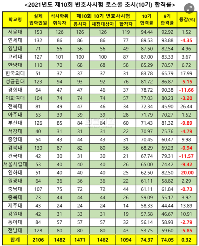 제10회 변호사시험 로스쿨별 초시합격률 분석해보니…