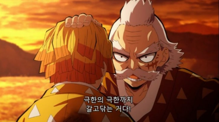 그 위기 상황을 벗어나는 데에는 할아버지와의 추억이 큰 힘이 되었습니다. 아무리 배워도 모든 형을 습득할 수 없었던 젠이츠는 할아버지에게 칼날로 때리는 것처럼 머리를 '빡 빡 빡' 얻어맞고, '그 누구보다 강인한 칼날이 되어라!'라는 말을 듣습니다. 이번 주제의 말은 툭하면 포기하고 도망치는 젠이츠를 강한 '주'로 키우기 위해, 강점을 하나라도 찾아내 성장시키려고 시행착오를 반복하는 할아버지의 말입니다.